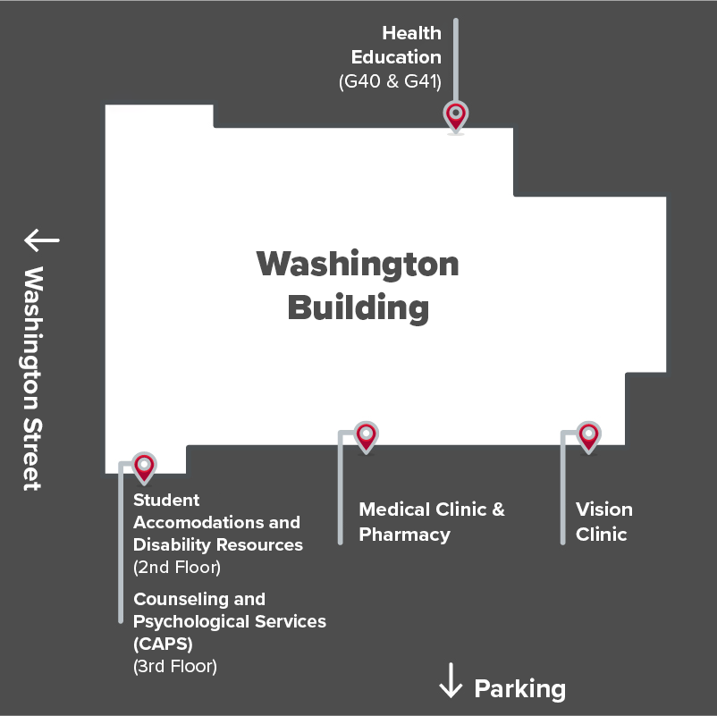 Students accessing Washington Building services (Cougar Health Services and Student Accommodations and Disability Resources) can park in the Washington Building's west parking lot, located off Washington Street.
